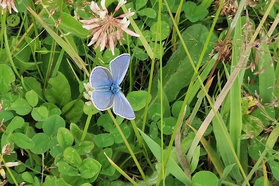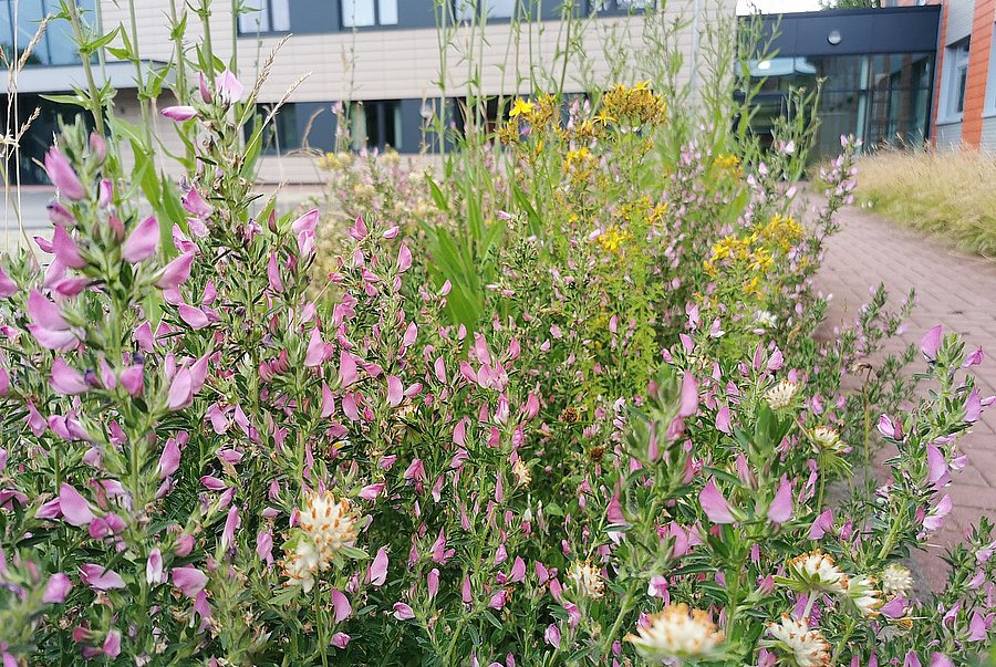 Gut 3.500 heimische, regio-zertifizierte Wildpflanzen, die von hiesigen Staudengärtnereien produziert wurden, sollen auf den ausgewählten Projektflächen mehr Nahrung für Insekten liefern. Dabei geht es nicht nur um den Nektar der Blüten. Viele Raupen heimischer Tag- und Nachtfalter sind sehr spezialisiert und benötigen bestimmte Futterpflanzen. Der Hauhechel-Bläuling beispielsweise legt seine Eier an verschiedene Kleearten, wie u.a. den Hornklee. Sind die Raupen geschlüpft, sitzen sie quasi direkt auf ihrer Leibspeise. Den knapp 300 in Schleswig-Holstein vorkommenden Wildbienen-Arten geht es vornehmlich um Pollen, den sie auf den Wildblumen sammeln und als dicke Pollenpakete zu jedem Ei in die Brutzelle packen. Je nach bevorzugter Wildblume kann das auch mal blau aussehen.